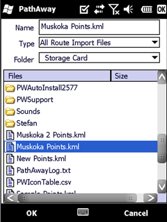 Once you have copied the "Muskoka Points.kml" file to your device folder, it's time to import them into PathAway. Run PathAway, then choose the menu "Trips->Import Trip". In the file selector dialog, select the "Muskoka Points.kml" file, and press OK.