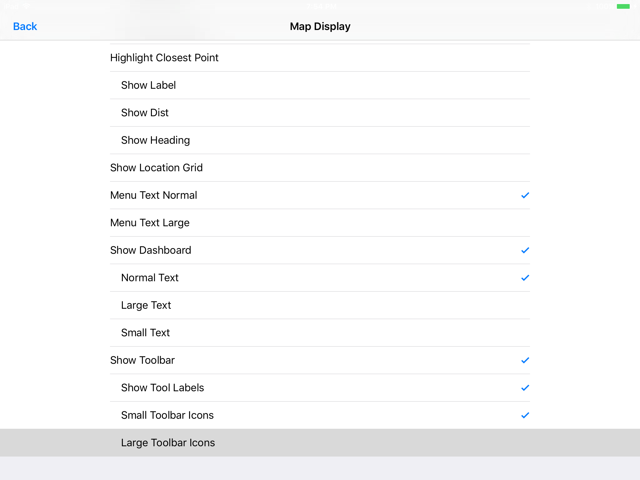 In the Map Display Settings screen, scroll to the bottom and turn on "Large Toolbar Icons".
